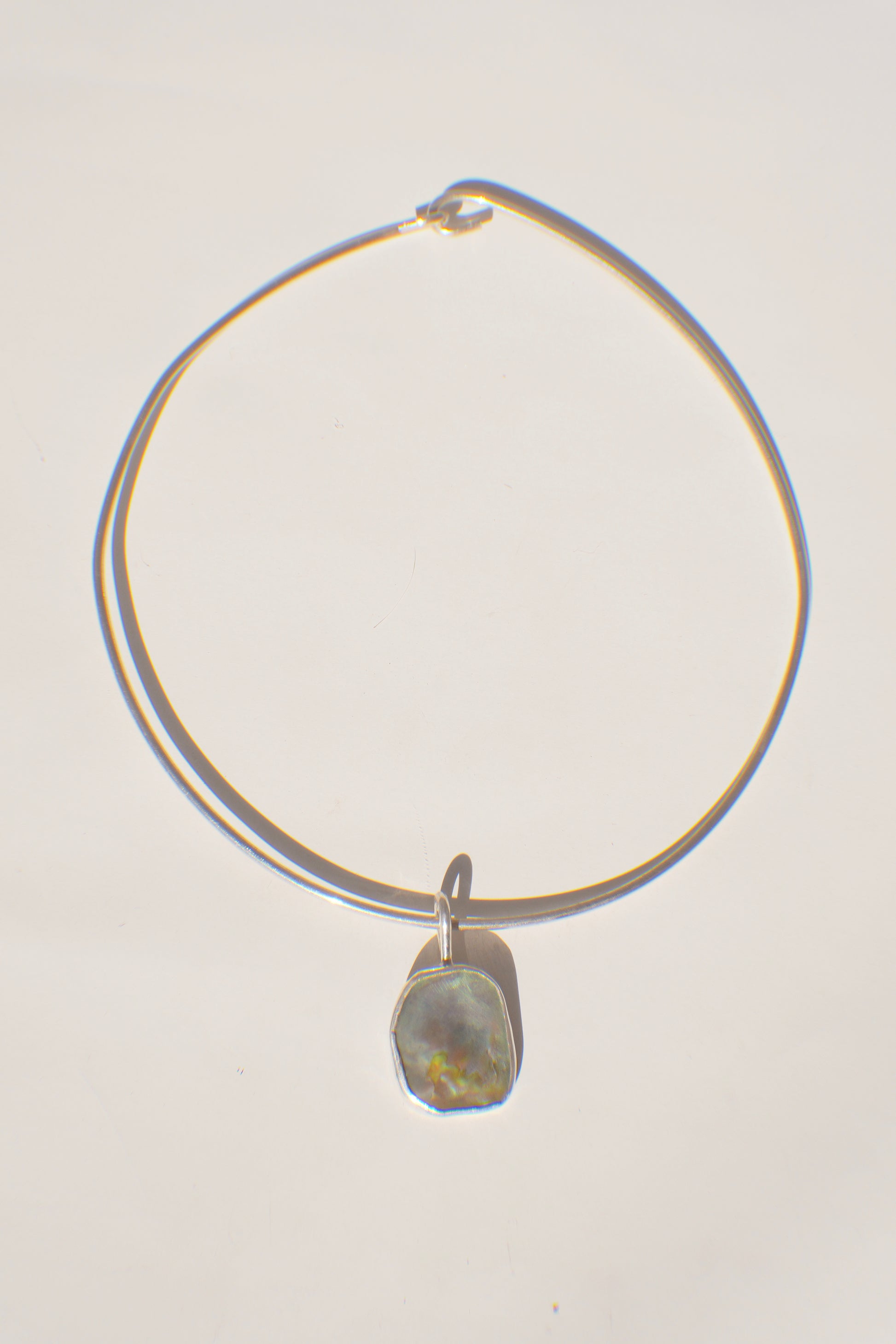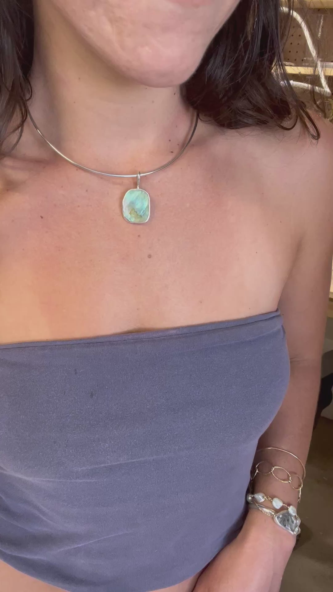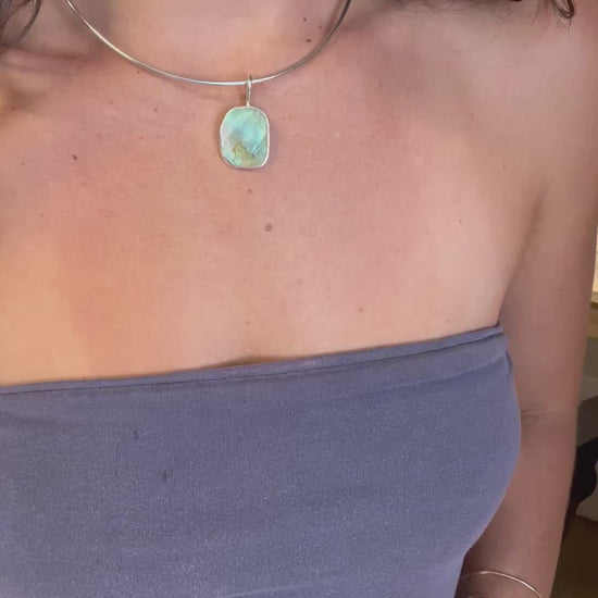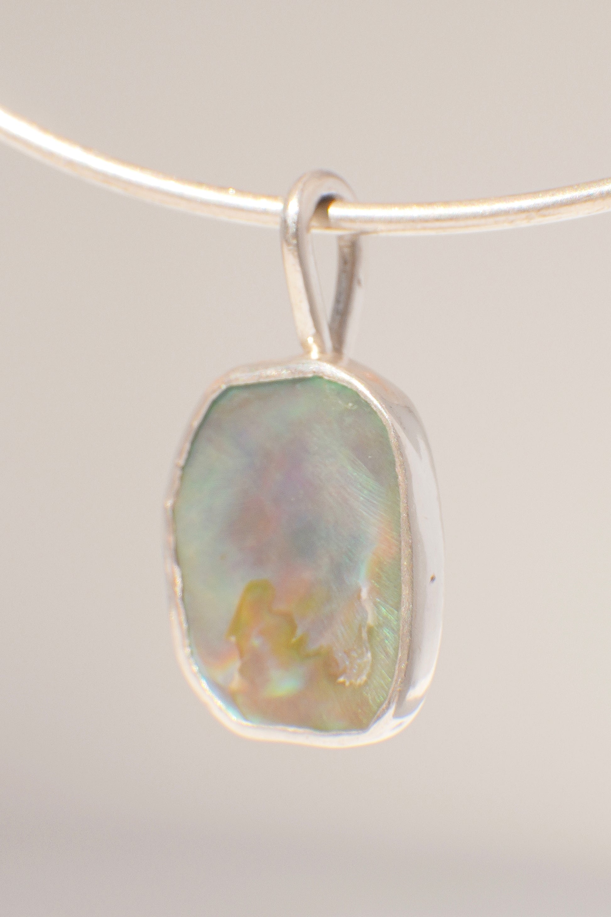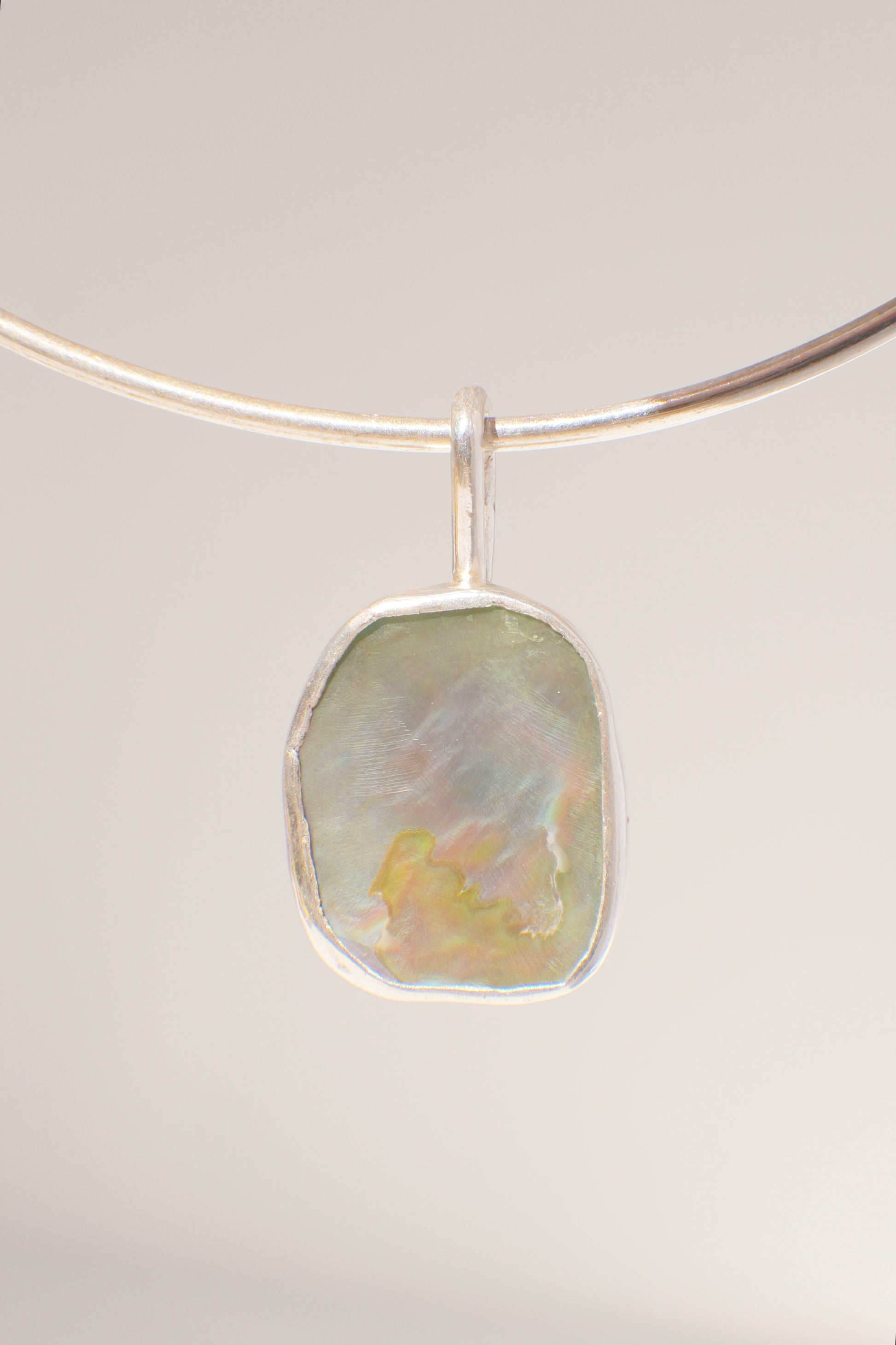 This abalone piece is green with a tint of blue. The bail is simple, hand formed like the choker chain with a round wire.