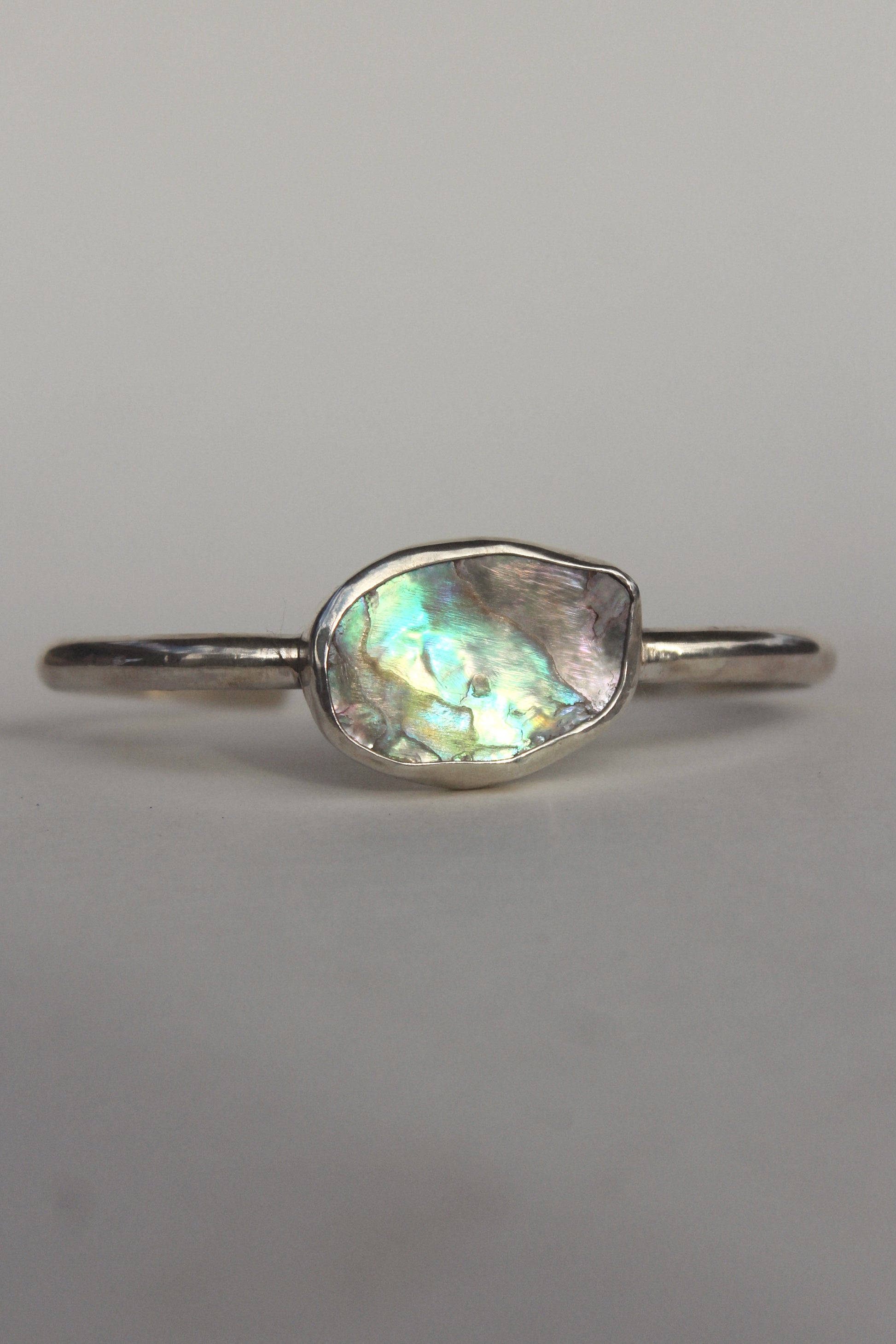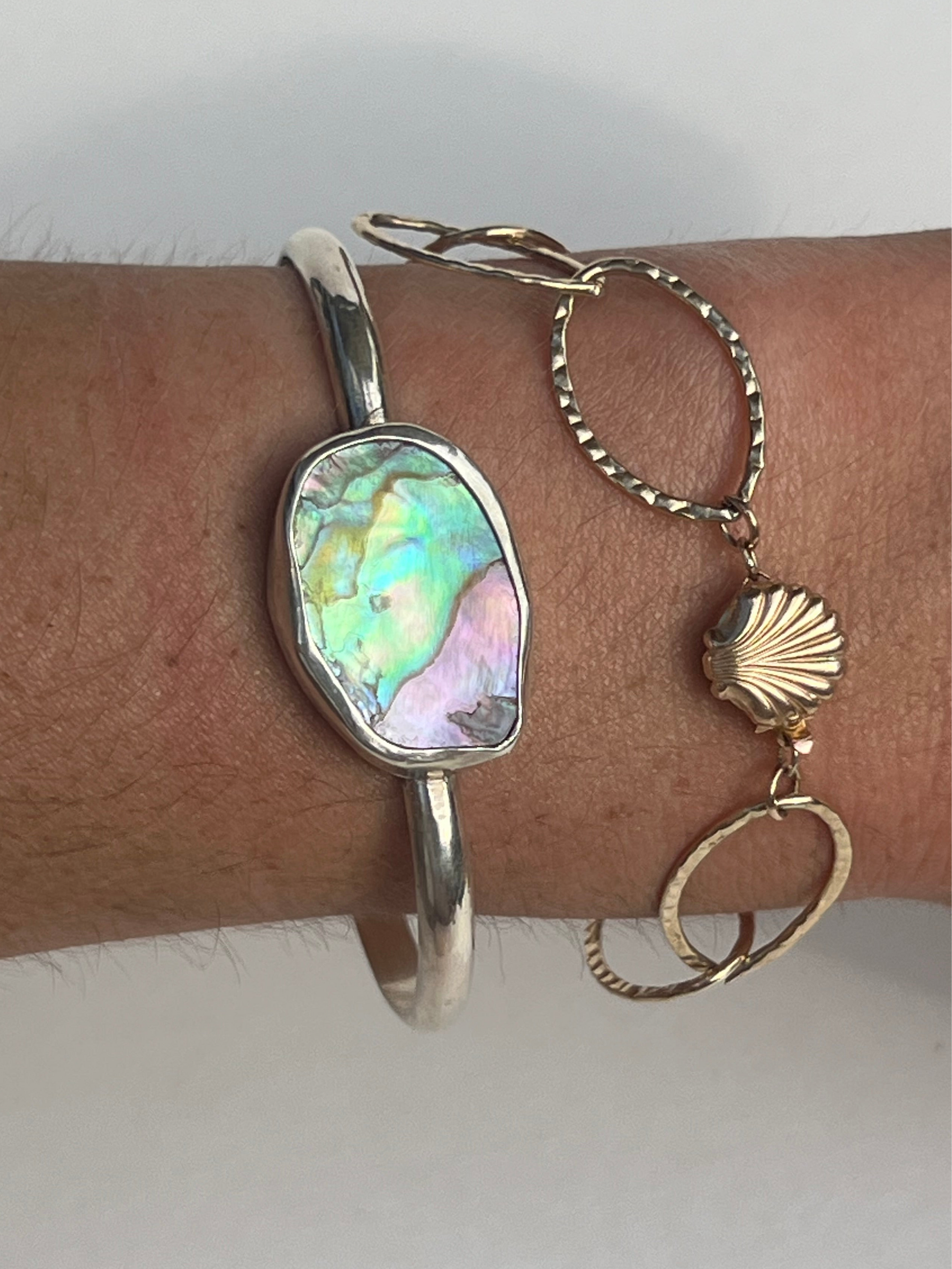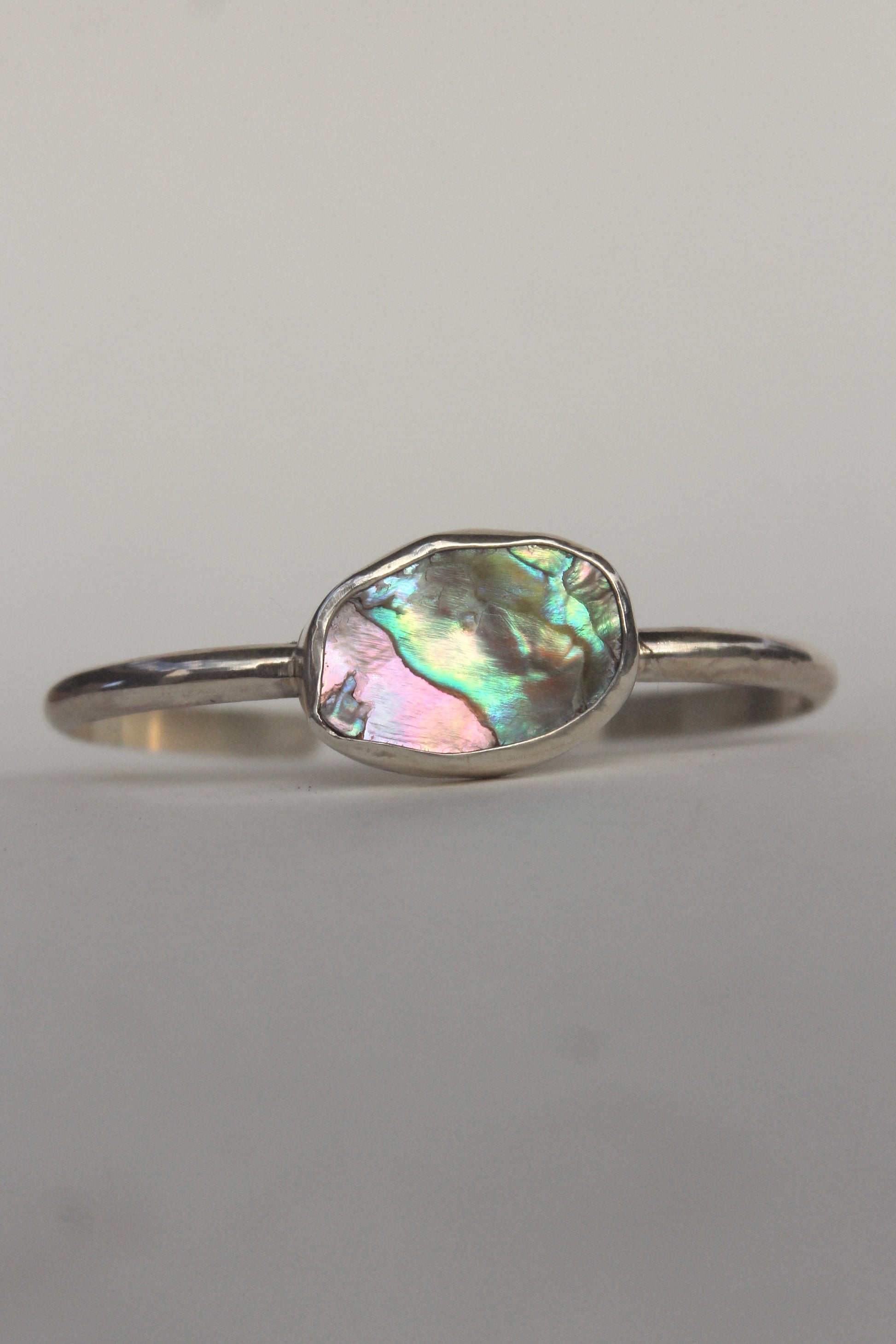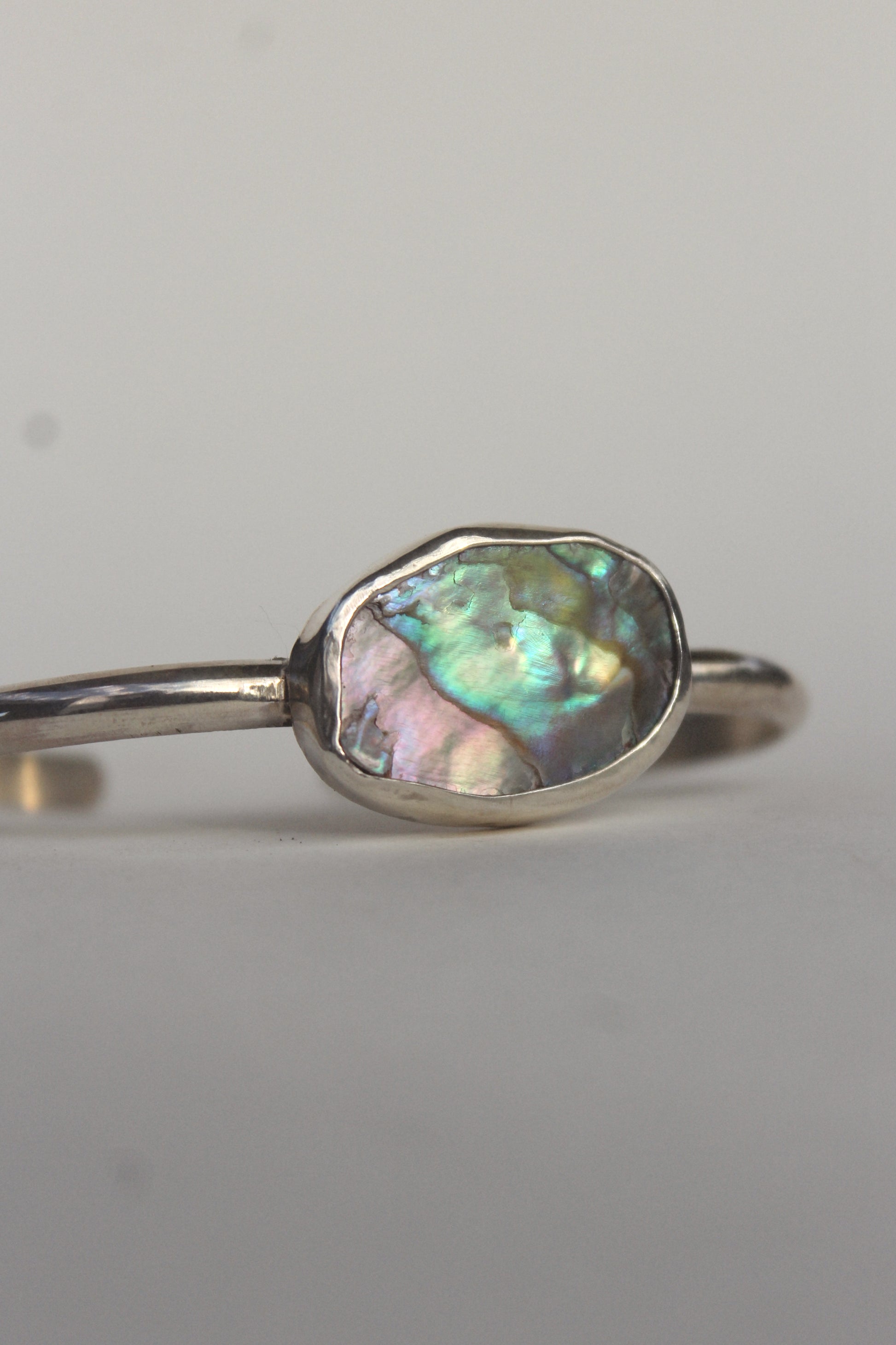 Each of these cuffs are one of a kind as no two pieces of abalone are the same. The abalone is from Northern California and the cuffs are made in Southern California with .925 sterling silver.