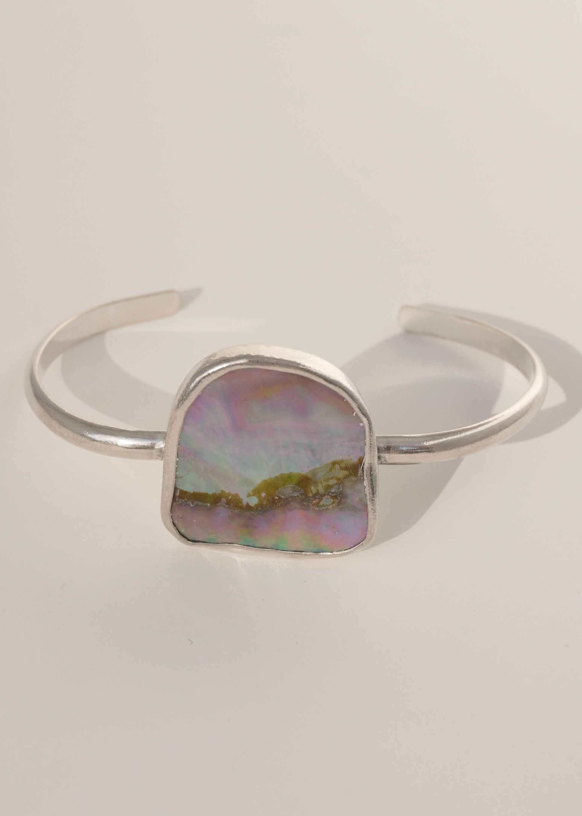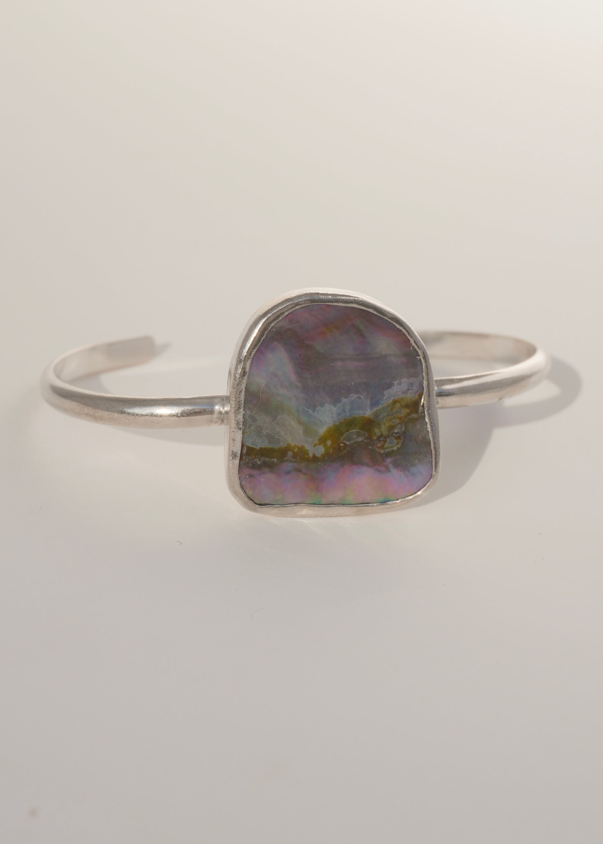 Each of these cuffs are one of a kind as no two pieces of abalone are the same. The abalone is from Northern California and the cuffs are made in Southern California with 999 fine silver and 925 sterling silver.