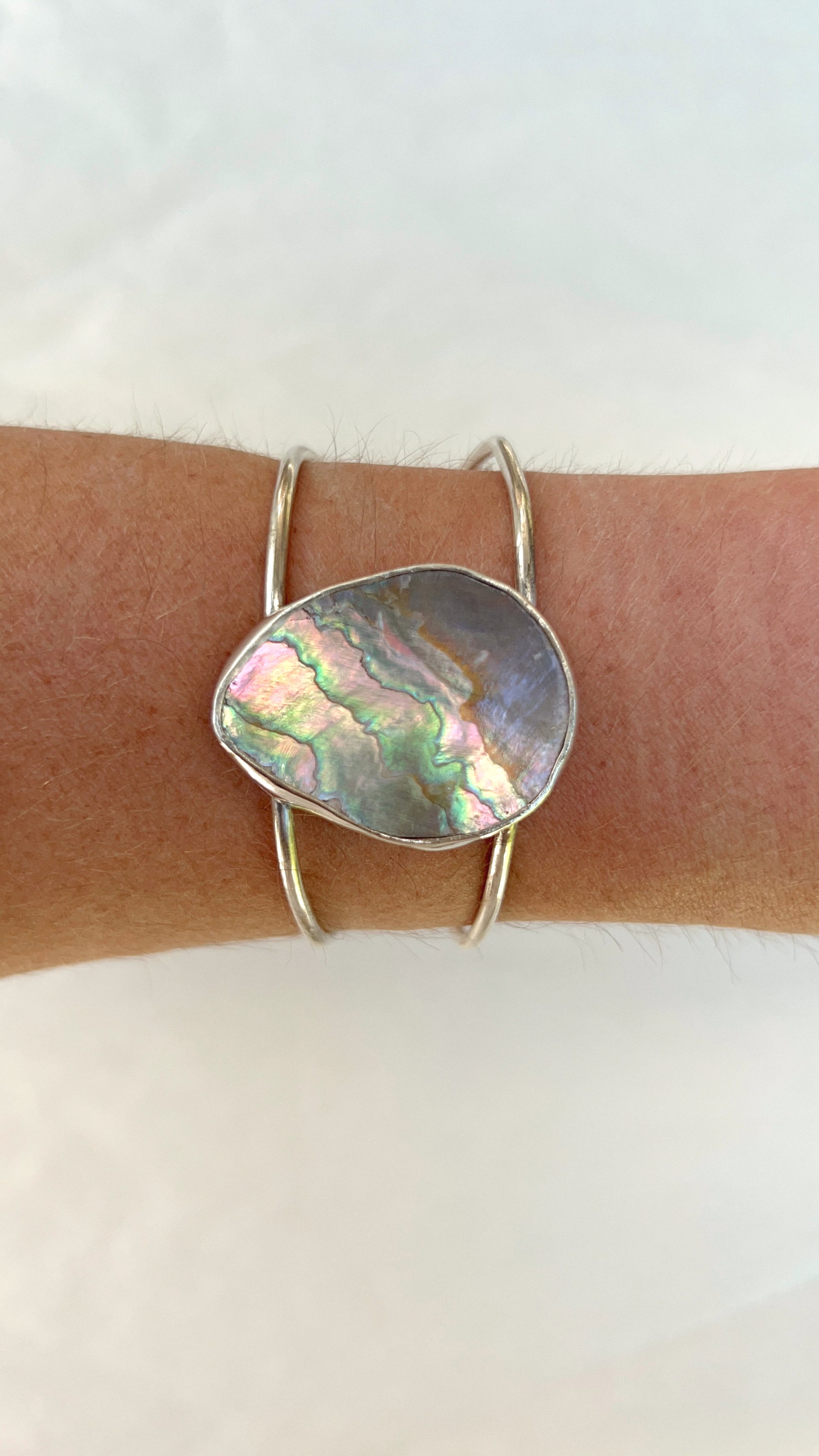 Each of these cuffs are one of a kind as no two pieces of abalone are the same. The abalone is from Northern California and the cuffs are made in Southern California with .925 sterling silver.