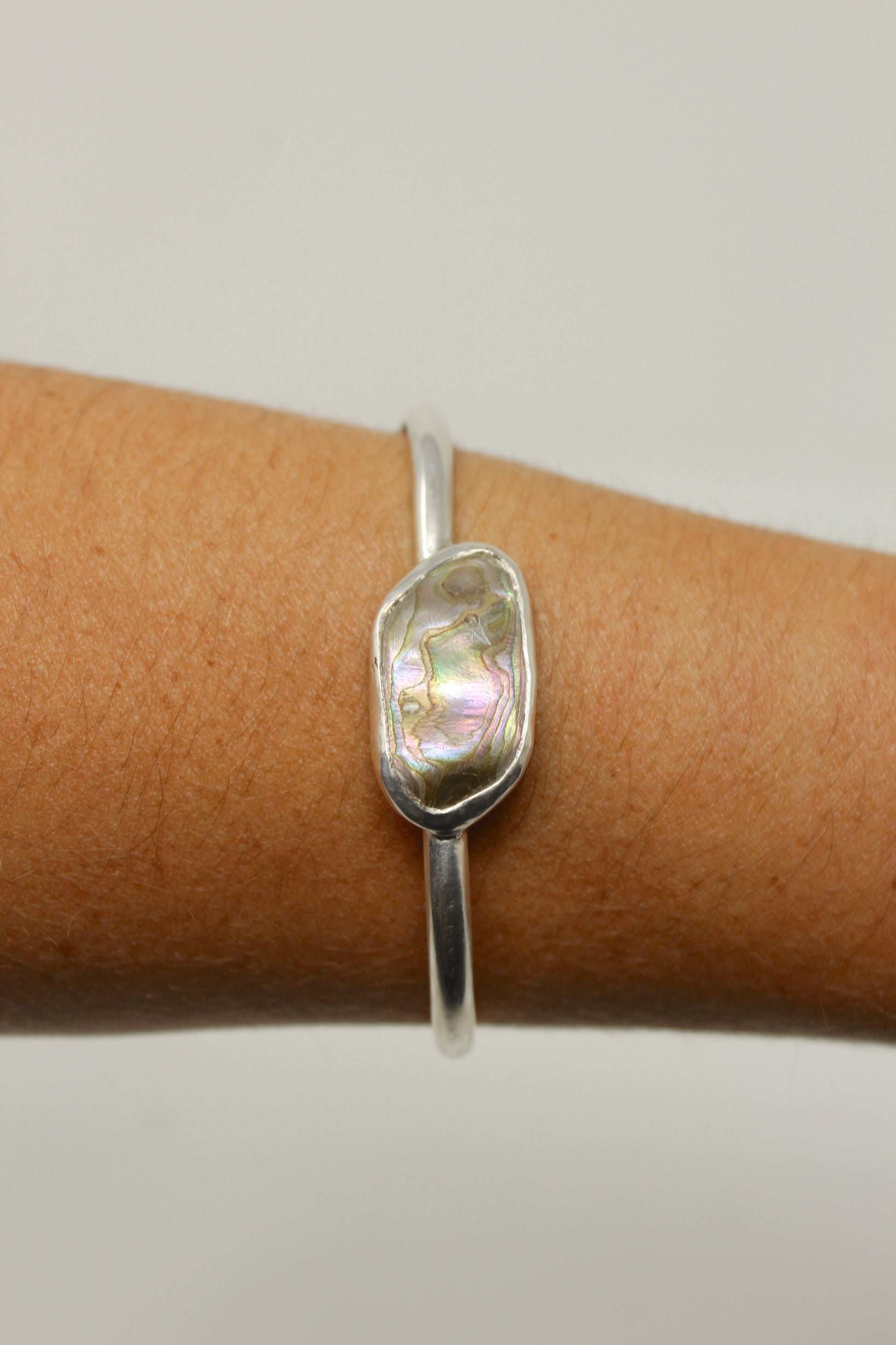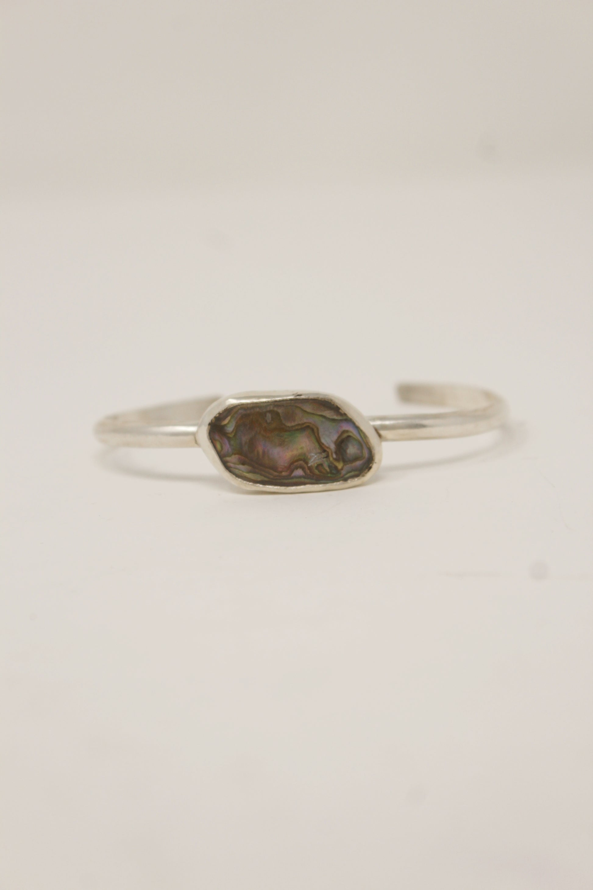 Each of these cuffs are one of a kind as no two pieces of abalone are the same. The abalone is from Northern California and the cuffs are made in Southern California with .925 sterling silver.