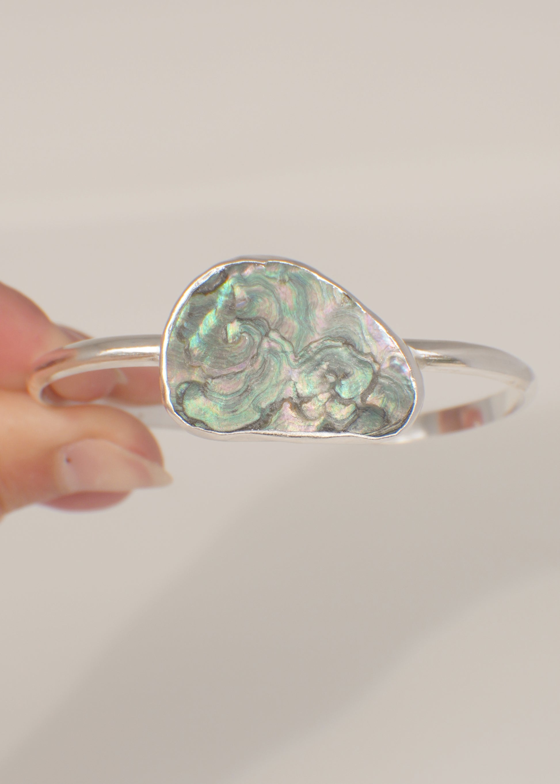 Each of these cuffs are one of a kind as no two pieces of abalone are the same. The abalone is from Northern California and the cuffs are made in Southern California with 999 fine silver and 925 sterling silver.