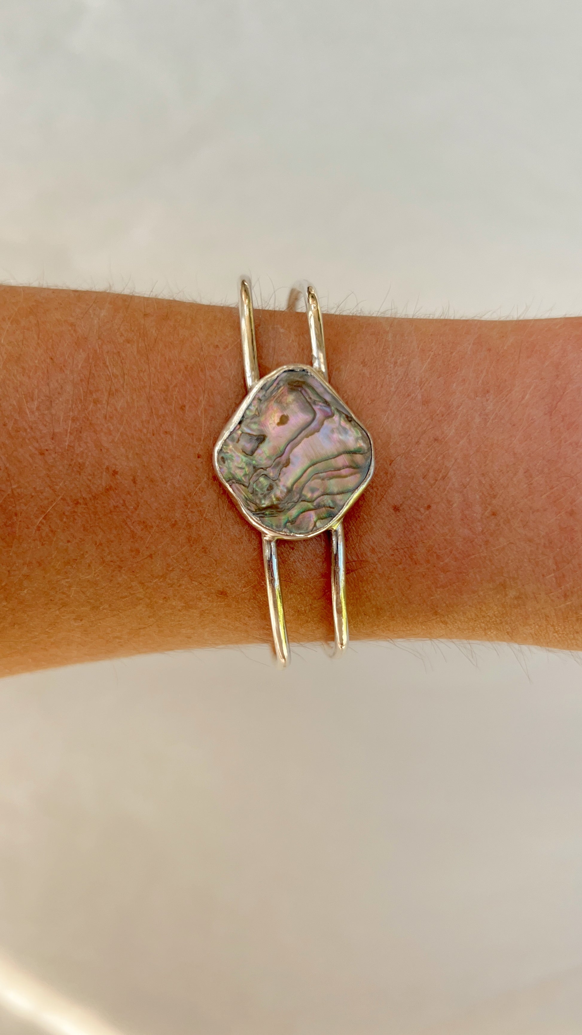 Each of these cuffs are one of a kind as no two pieces of abalone are the same. The abalone is from Northern California and the cuffs are made in Southern California with .925 sterling silver.