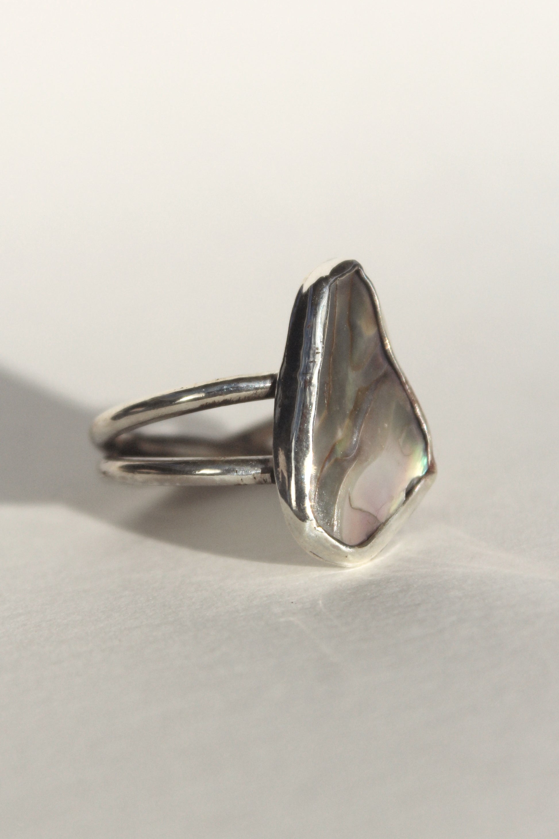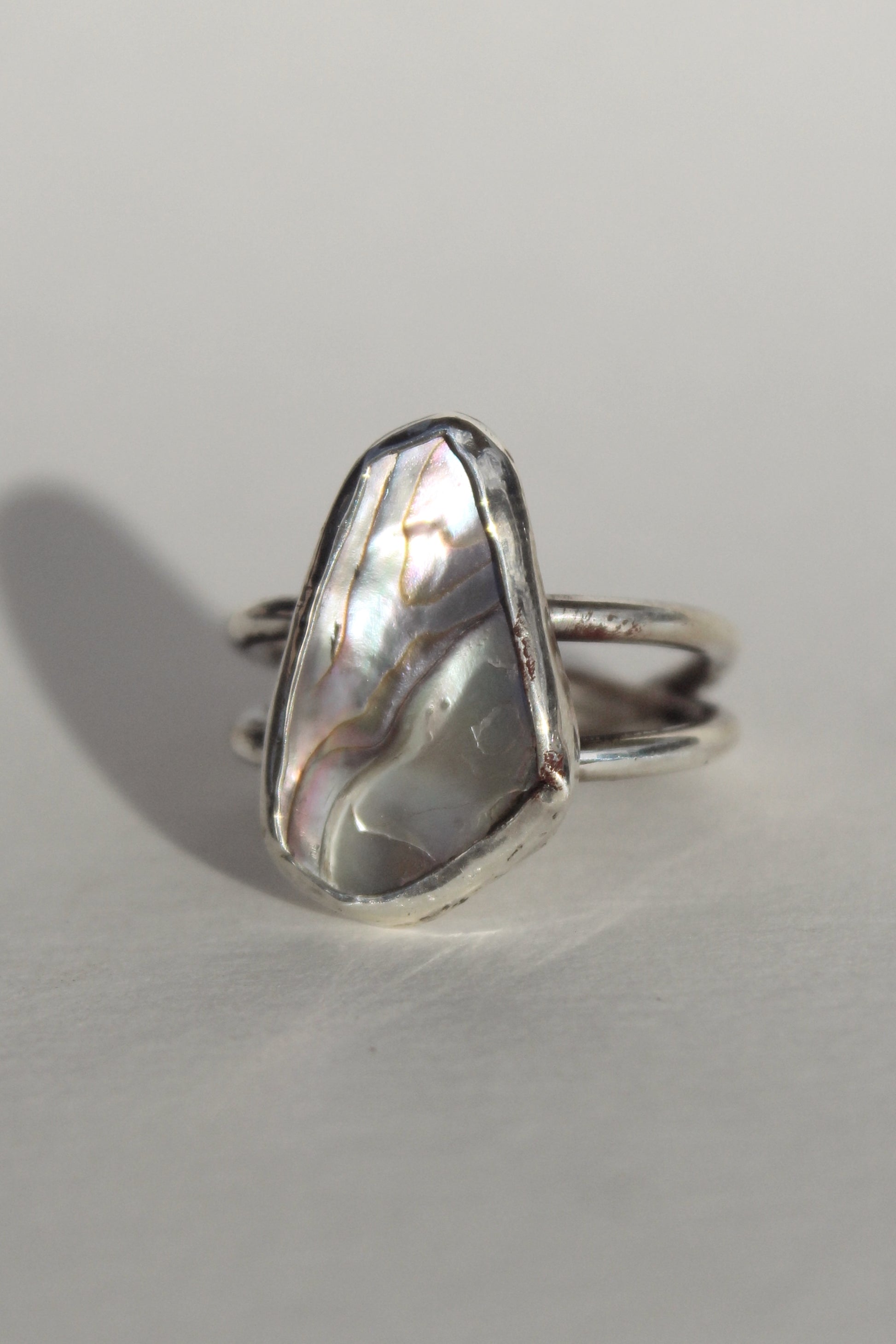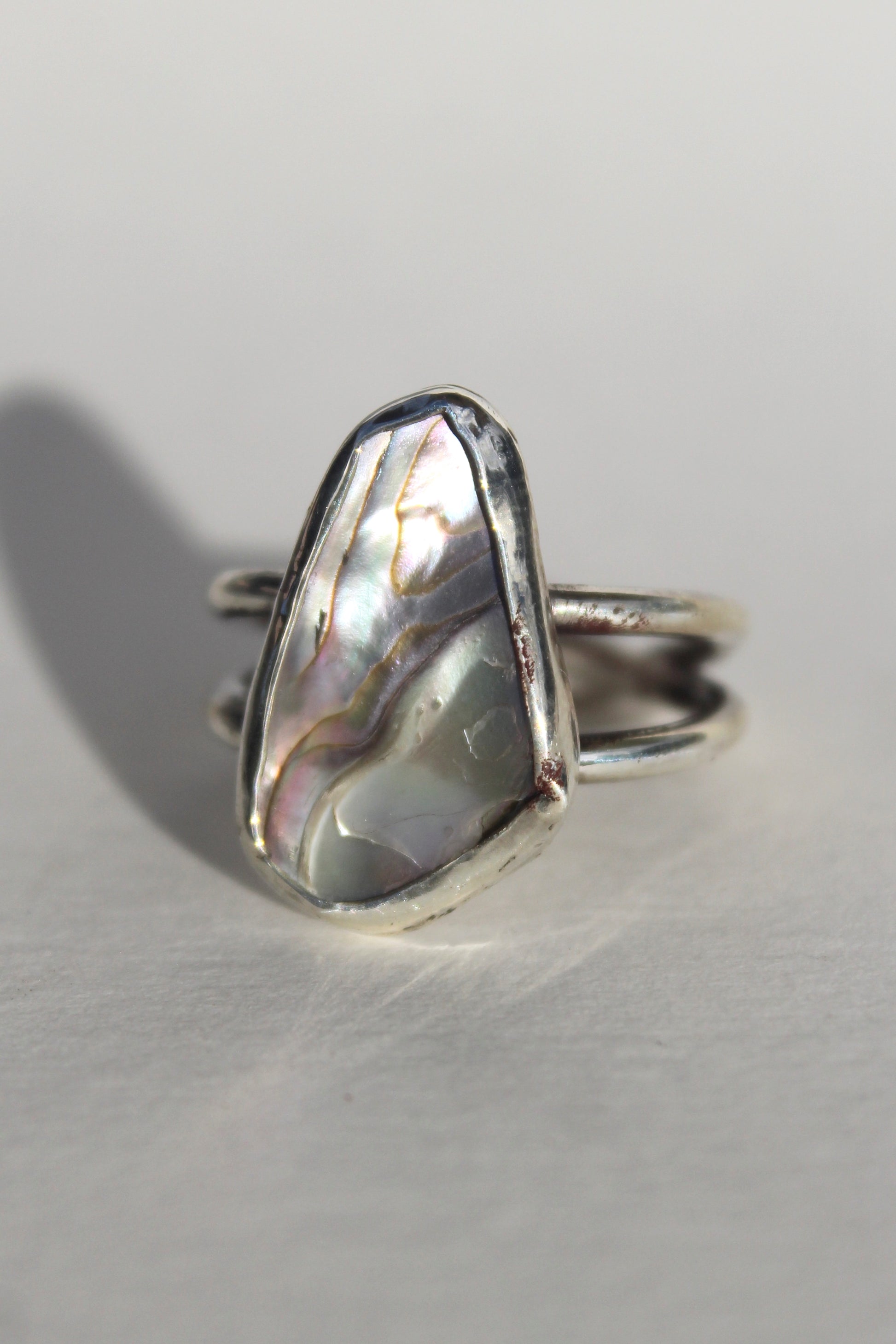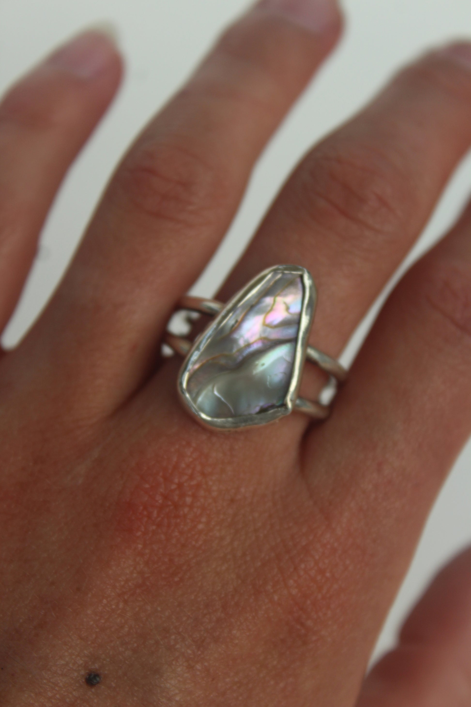 This abalone ring is made with .925 sterling silver and abalone from Northern California.