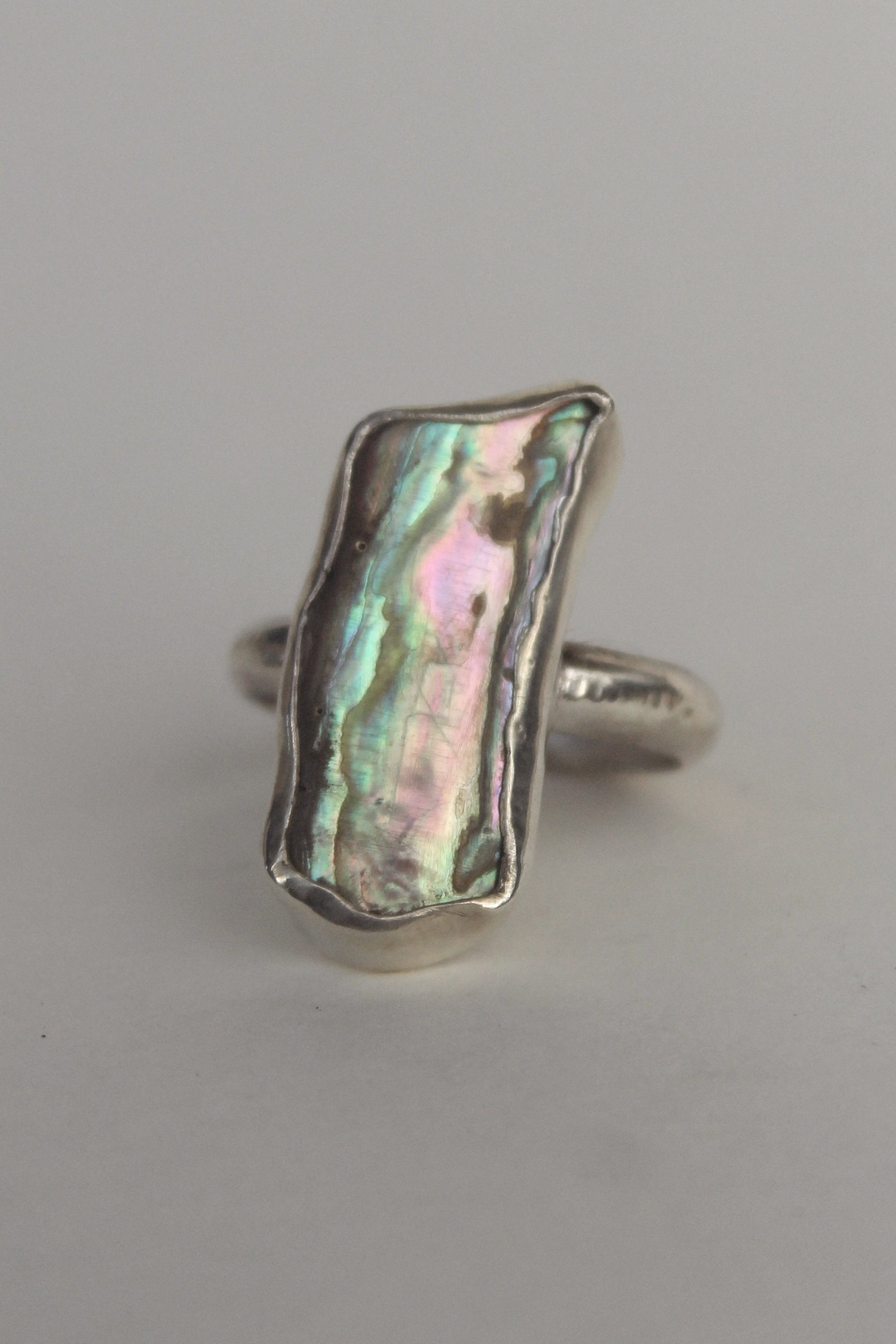 This abalone ring is made with .925 sterling silver and abalone from Northern California.