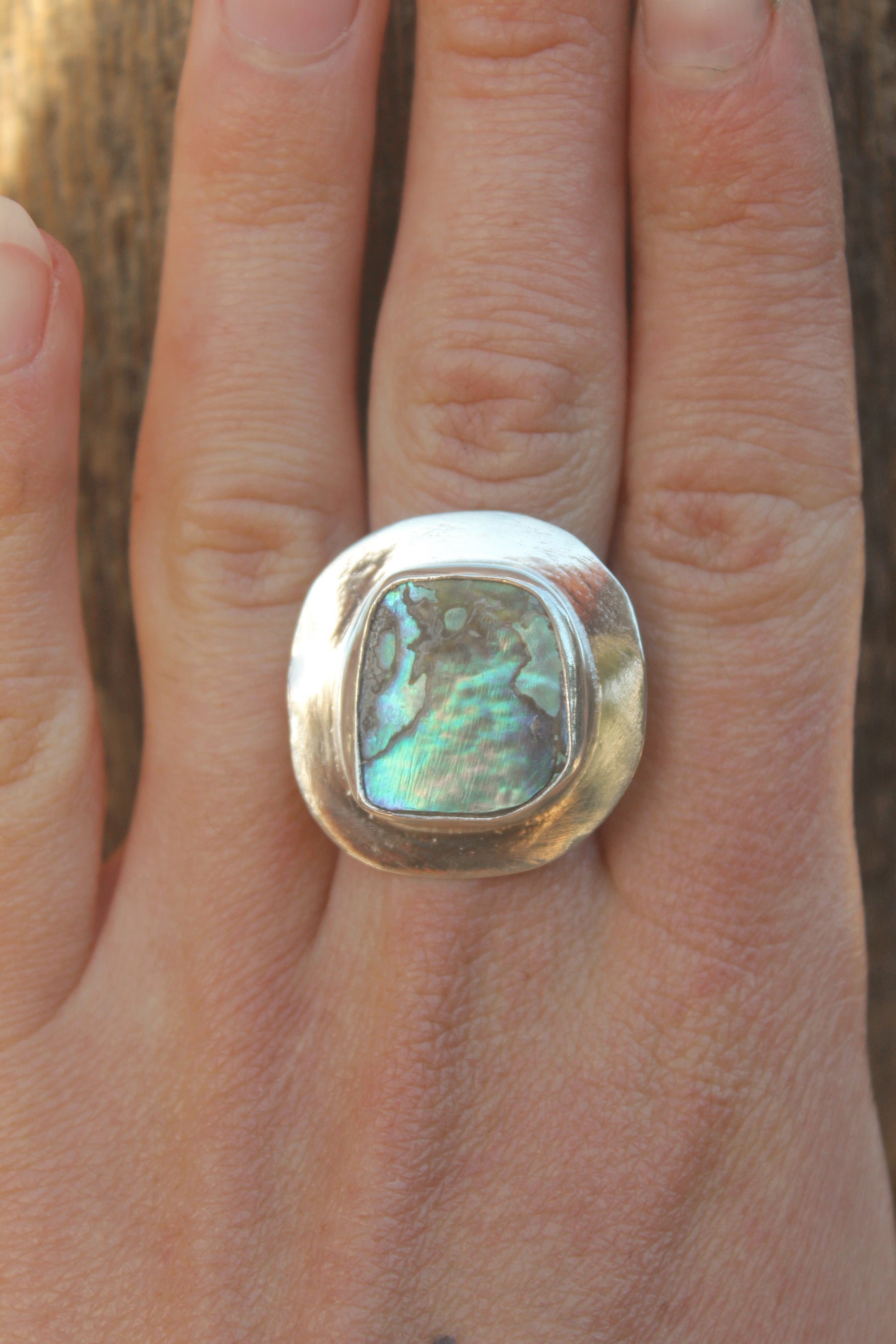 Handcrafted with 925 sterling silver and a small piece of abalone, this ring features a wide brim for a bold look with a chunky band below it for security