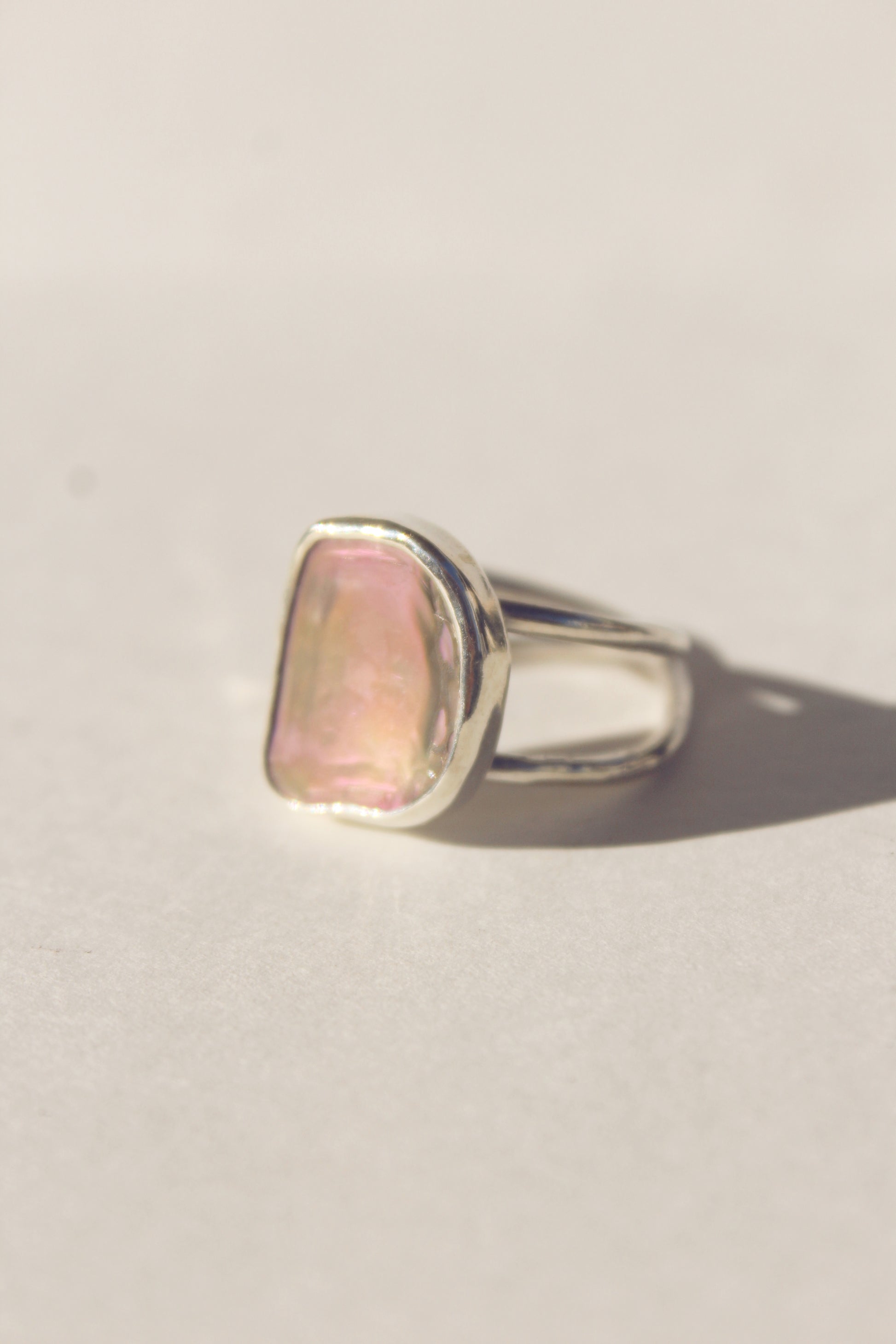 Handcrafted with 925 sterling silver and a cotton candy pink piece of abalone that is also slightly blue at other angles, and set on a double band for a statement finish