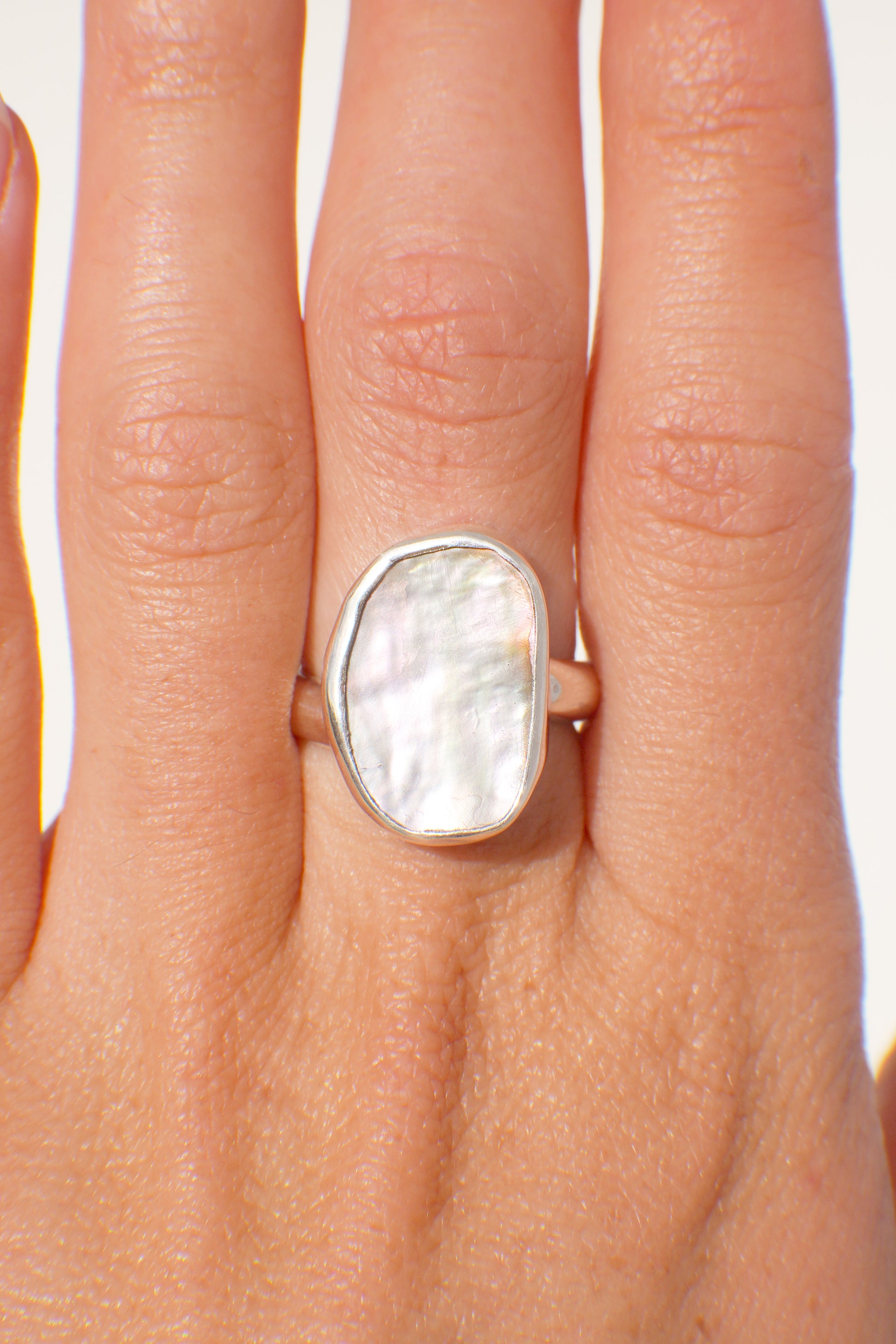 Handcrafted with 999 fine silver, 925 sterling silver and a piece of abalone, set on a chunky band.