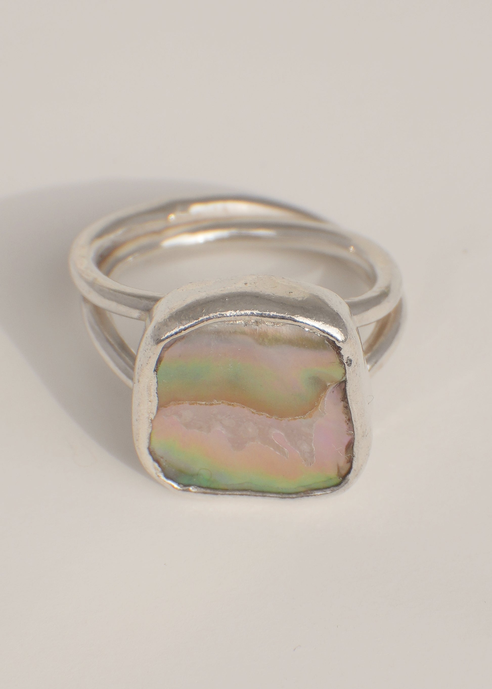 Handcrafted with 999 fine silver, 925 sterling silver and a piece of abalone, set on a double band.