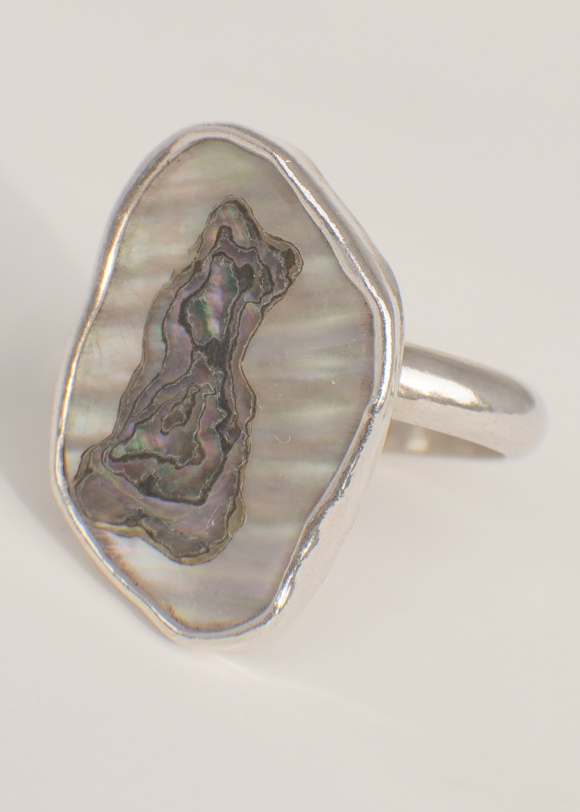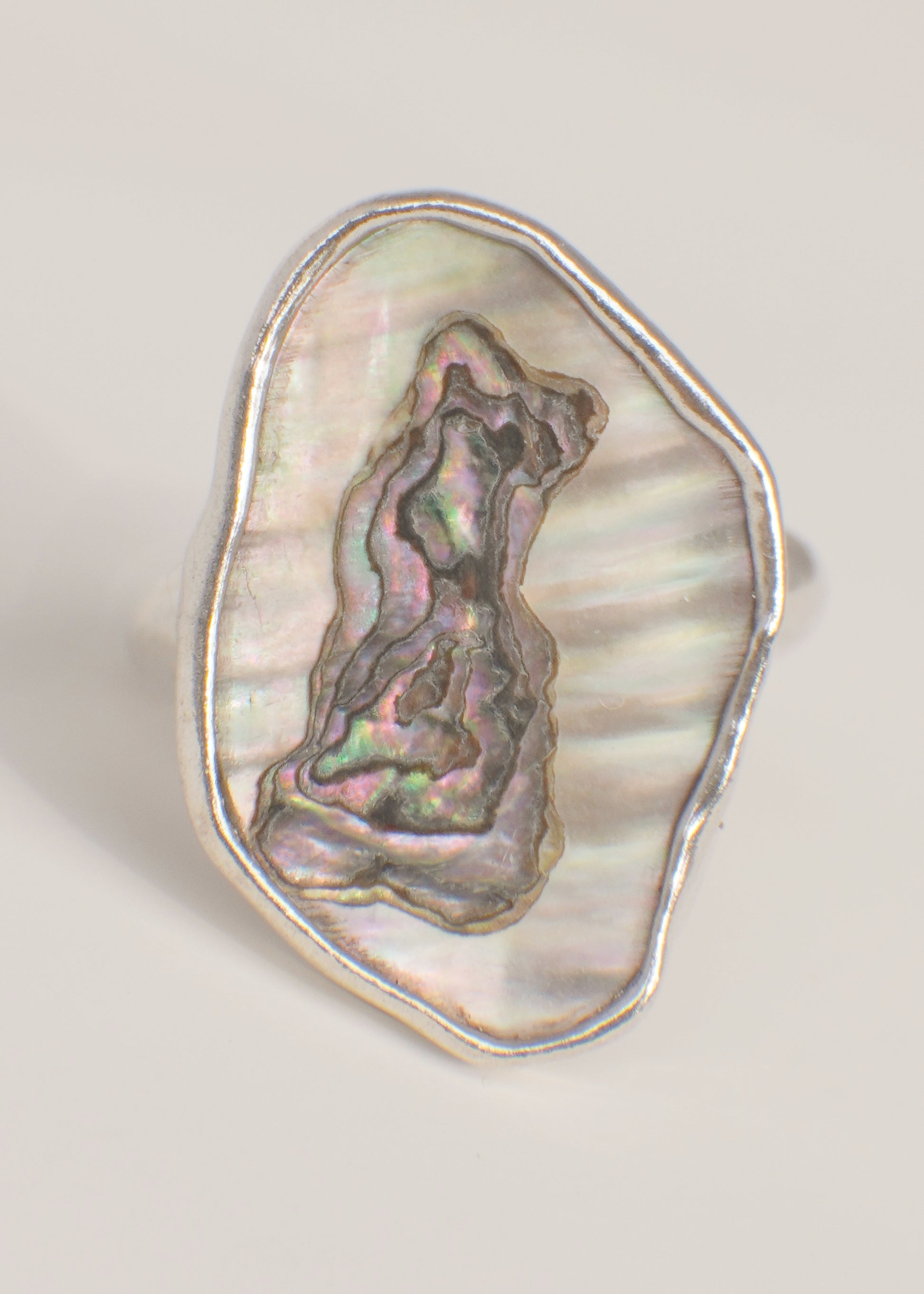 Handcrafted with 999 fine silver, 925 sterling silver and a piece of abalone, set on a chunky band.