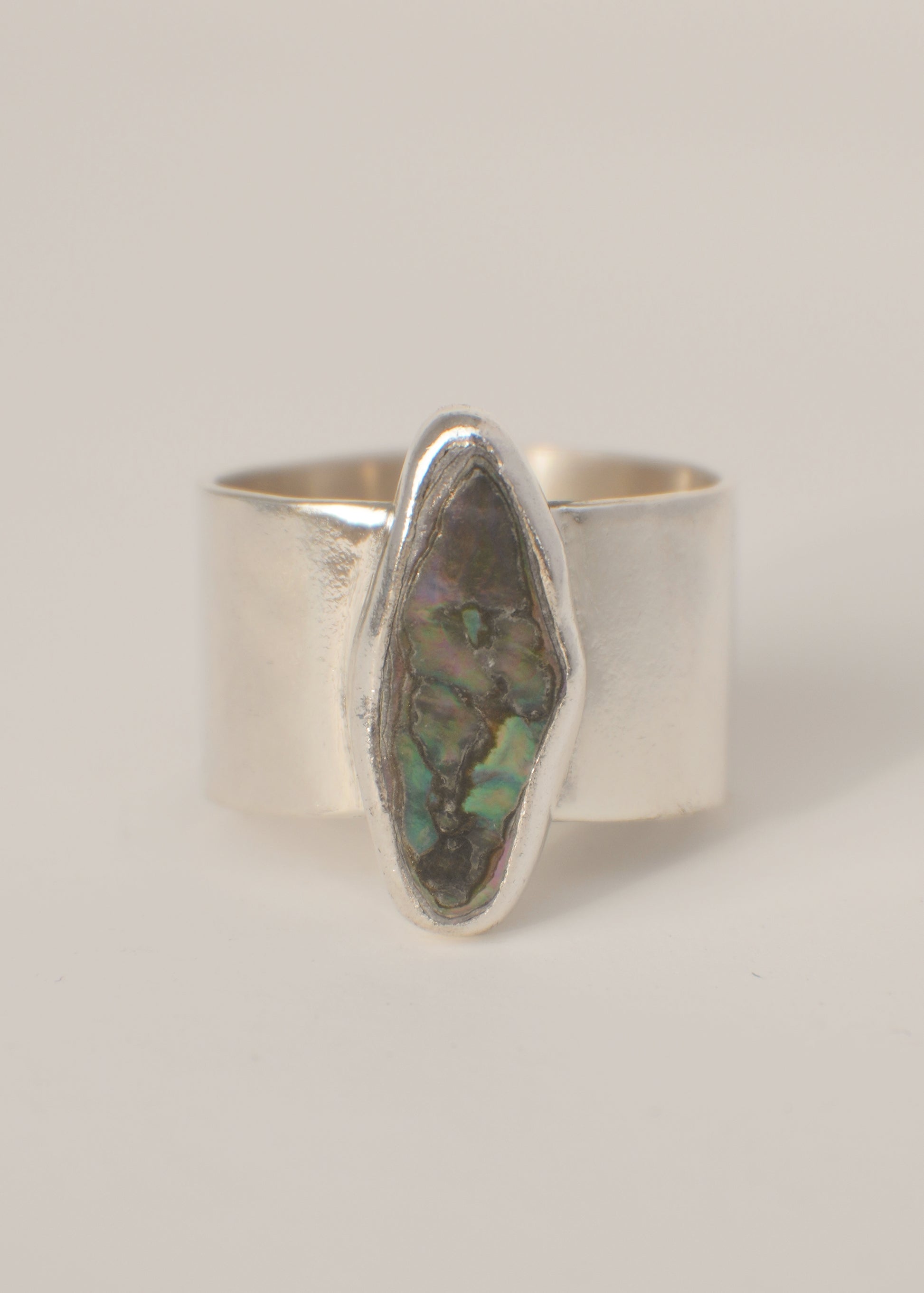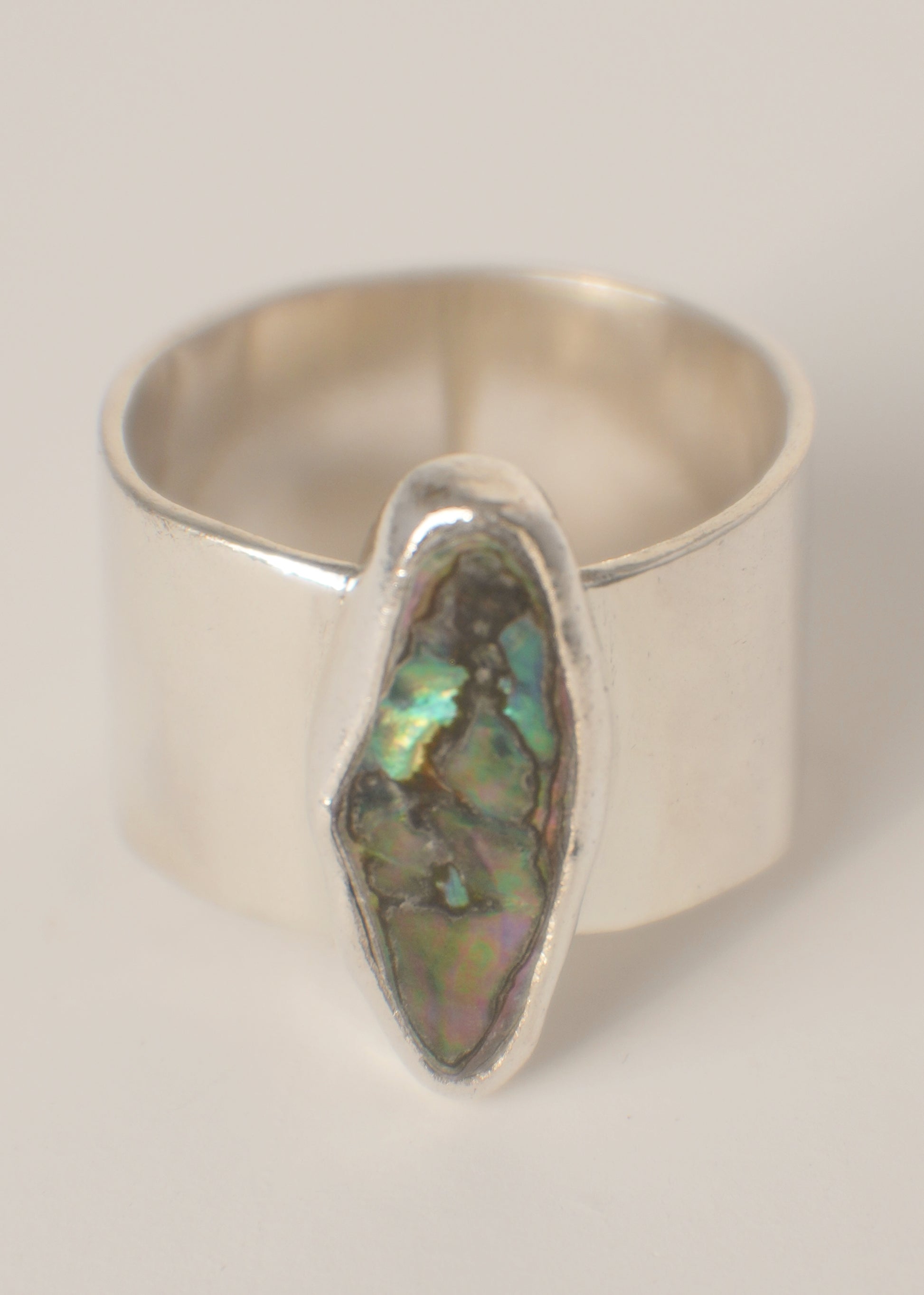 Handcrafted with 999 fine silver, 925 sterling silver and a piece of abalone, set on a wide band which is our newest style.