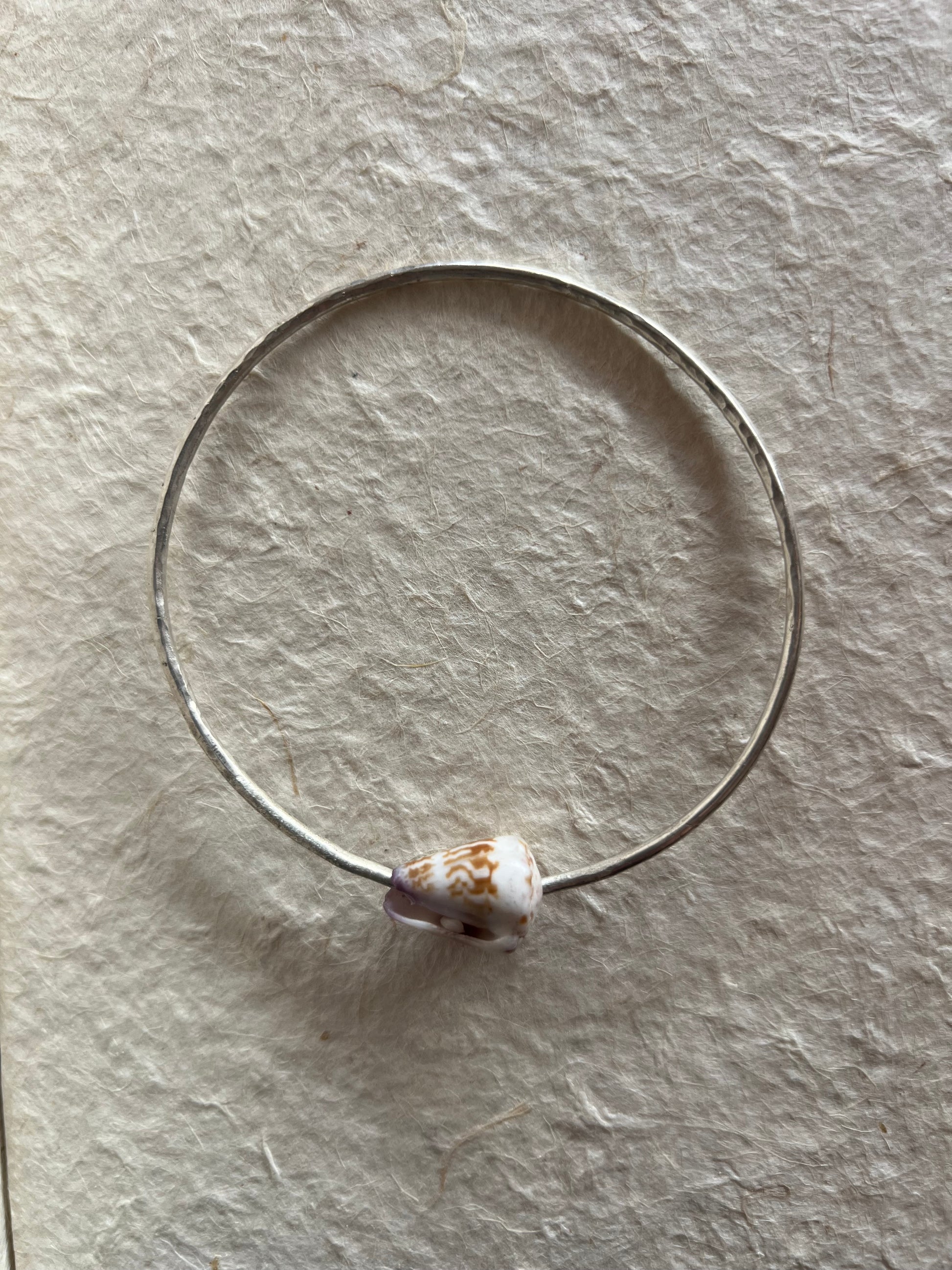 This bangle specifically has a cone shell on it and a round finish. Can be hammered at request which would also make it slightly larger.