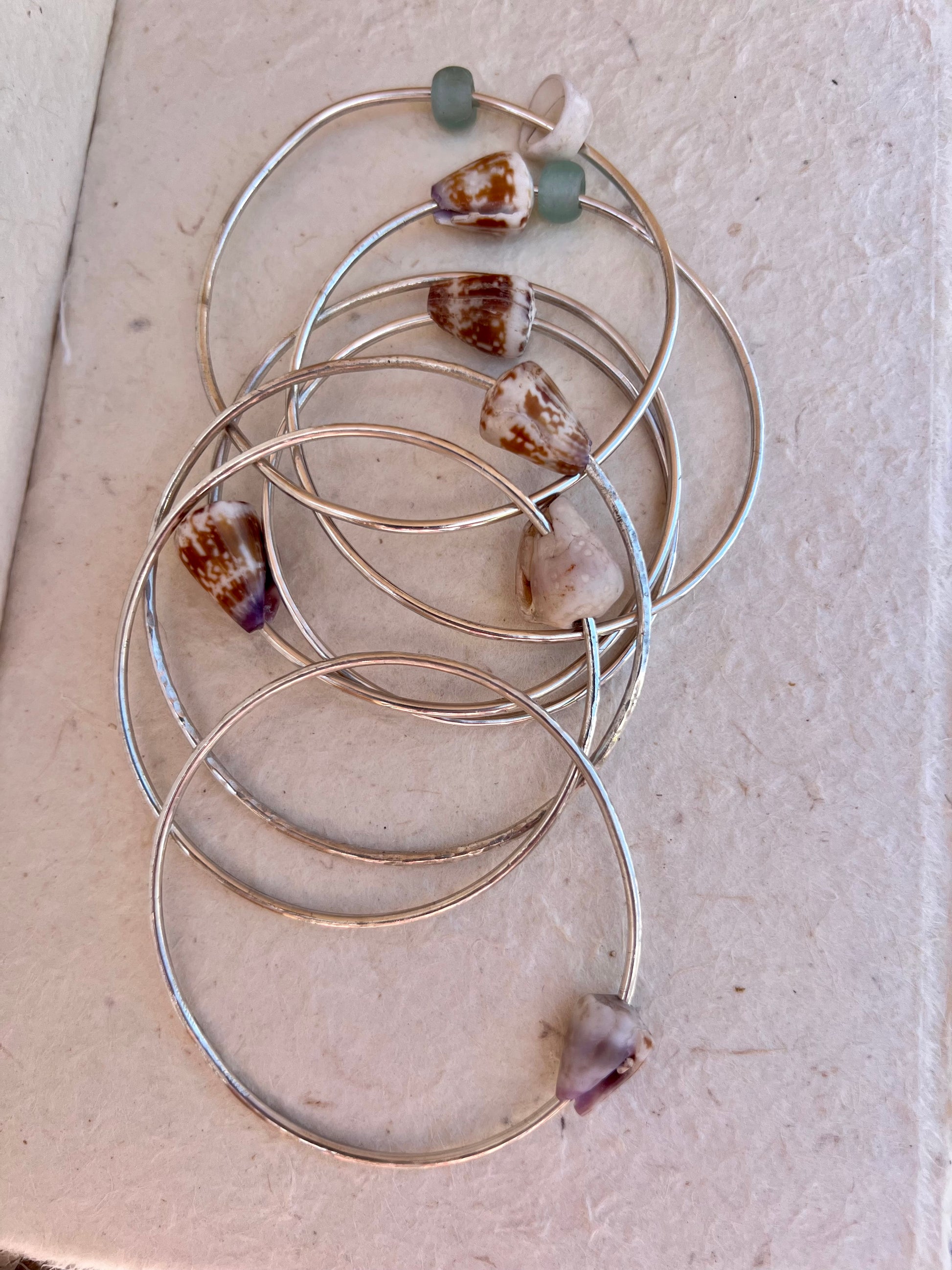 Each of these bangles are one of a kind due to the shells being slightly different than each other even when they are the same kind of shell.