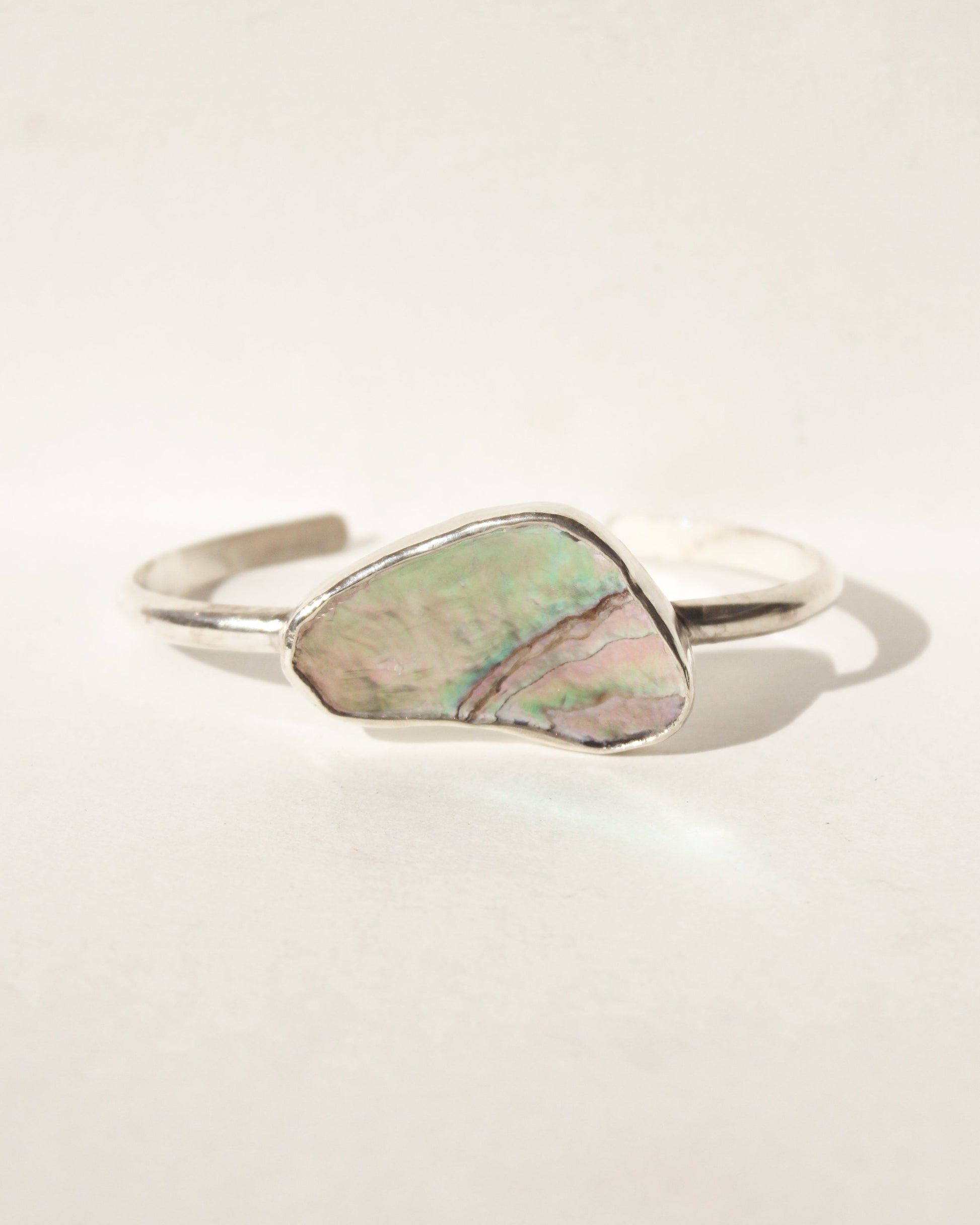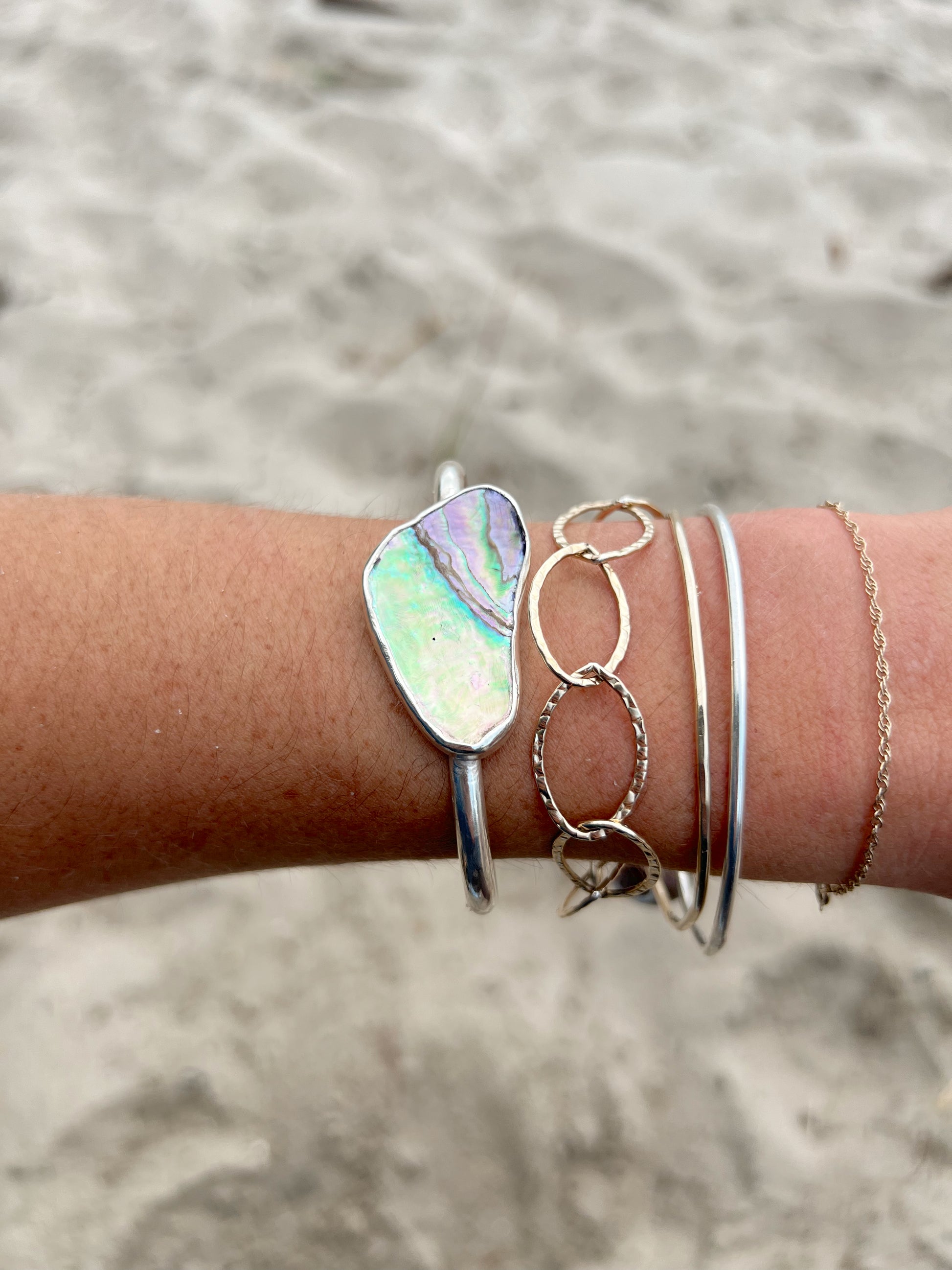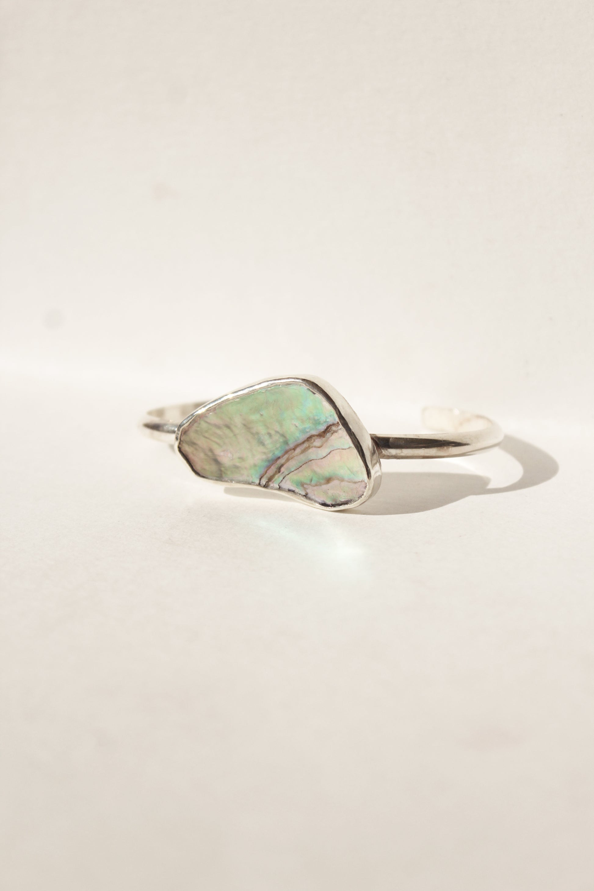 Each of these cuffs are one of a kind as no two pieces of abalone are the same. The abalone is from Northern California and the cuffs are made in Southern California with .925 sterling silver.