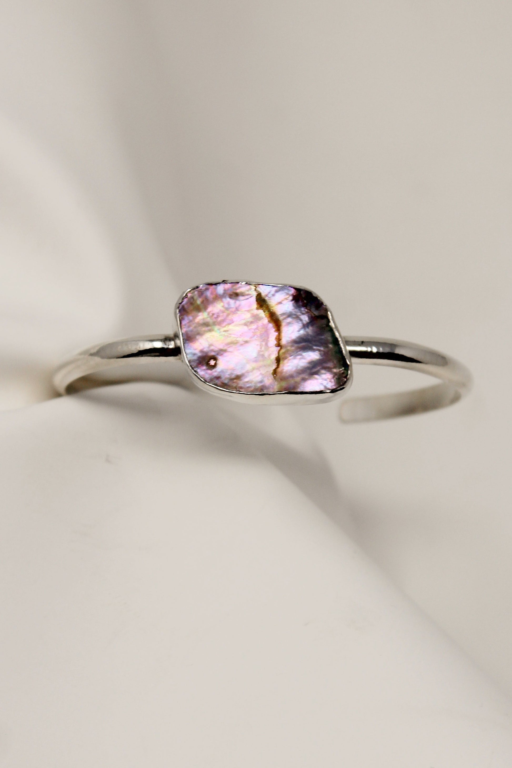 Each of these cuffs are one of a kind as no two pieces of abalone are the same. The abalone is from Northern California and the cuffs are made in Southern California with .925 sterling silver.