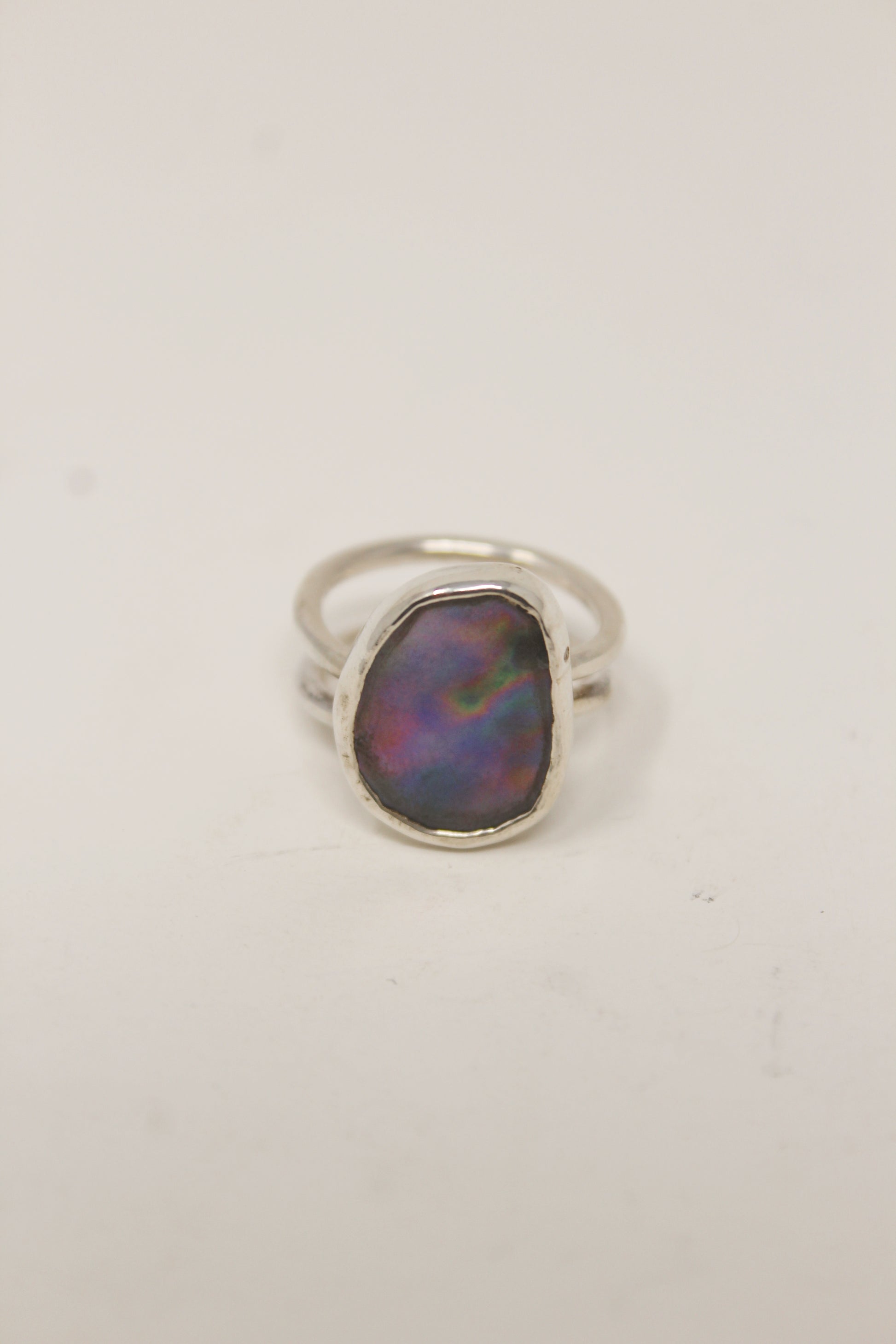 Handcrafted with 925 sterling silver and a small piece of abalone, set on a double band.
