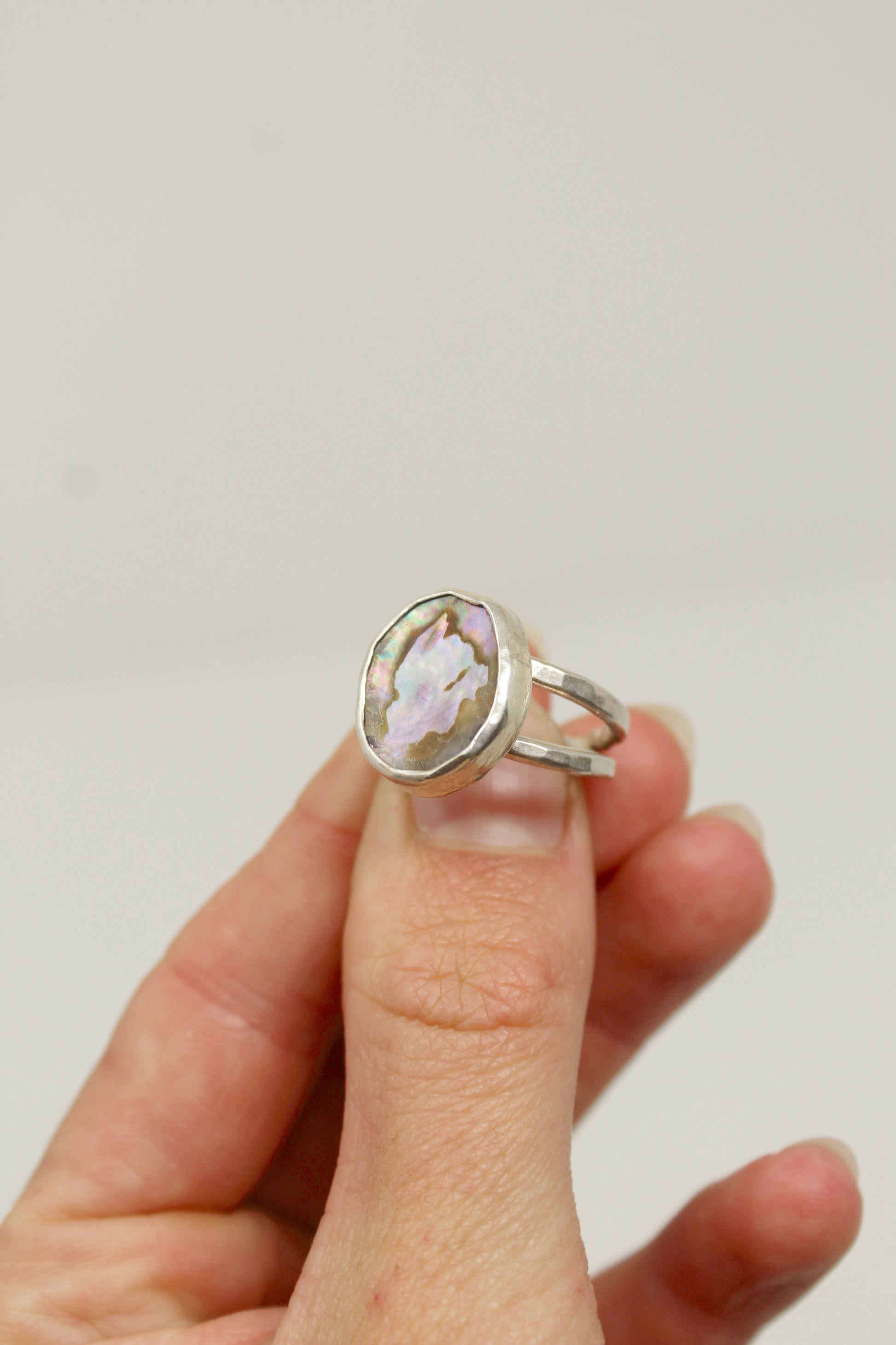 Handcrafted with 925 sterling silver and a small piece of abalone, set on a hammered double band.